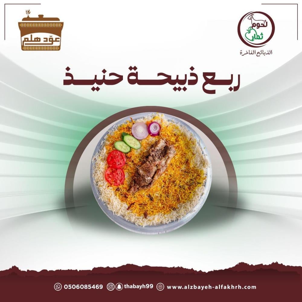 يقدم على صحن واحد من ذبايح محايل البلدي الدهم وبحنيذ على الطريقة التقليدية الاصيله بالإضافه إلى مجموعه من أطباق الإيدام وبنكهة عود هلم المميزة